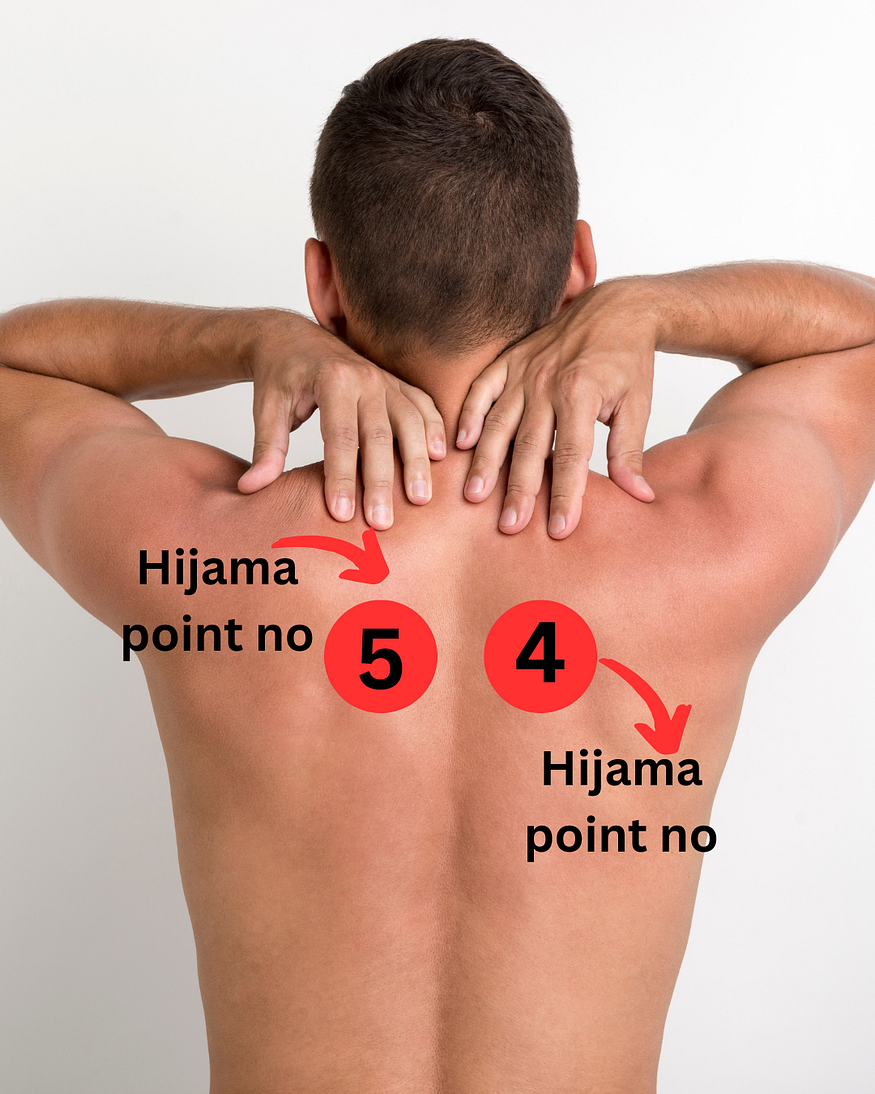 Hijama points 4 and 5 are located at the base of the neck, between the shoulder blades.